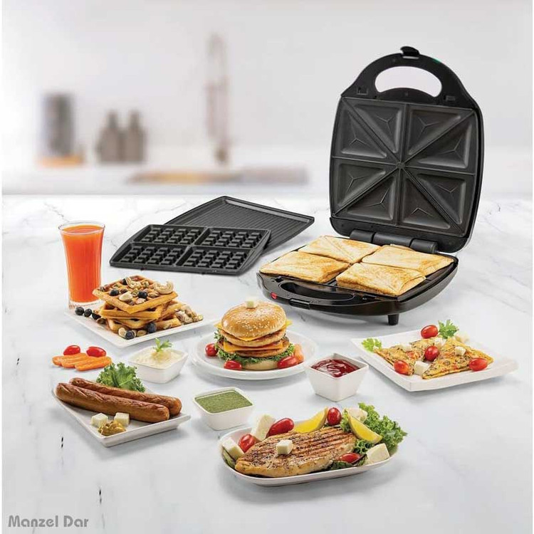 توان مصرفی ۱۴۰۰ وات، دارای صفحات ساندویچ ساز، گریل و وافل ساز، پوشش صفحات از جنس تفلون نچسب و با کیفیت بالا، قابلیت استفاده بصورت حالت باز ۱۸۰ درجه، صفحات جداشو و قابل شستشو، قابلیت آماده ساز هر بار ۴ عدد نان تست یا ۸ تکه مثلثی، قابلیت گریل کردن مرغ، ماهی، گوشت و سبزیجات، قابلیت آماده سازی چهار عدد وافل در هر مرتبه استفاده